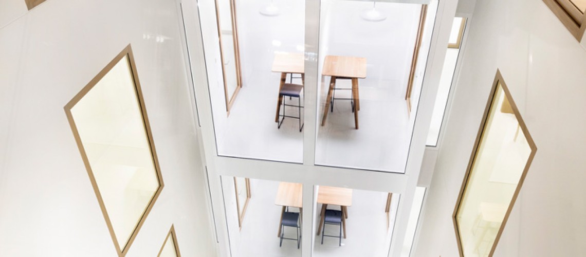 Die beiden Gebäude an der Vadianstrasse sind über 40 Jahre alt. Haustechnik, Fenster und Wärmedämmung entsprachen nicht mehr den heutigen Anforderungen und wurden deshalb ausgetauscht und modernisiert. Die Natursteinfassade dagegen ist in einem einwandfreien Zustand und wurde deshalb so belassen. Im Innern des Gebäudes wurden in der Mittelzone zwei gebäudehohe Lichthöfe geschnitten. Dadurch fällt nun Tageslicht bis ins Erdgeschoss, was die Nutzung dieser Zone deutlich attraktiver macht.