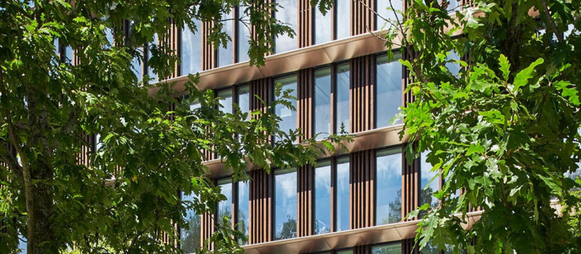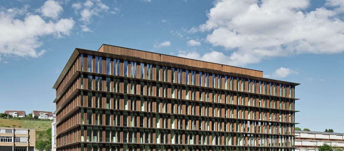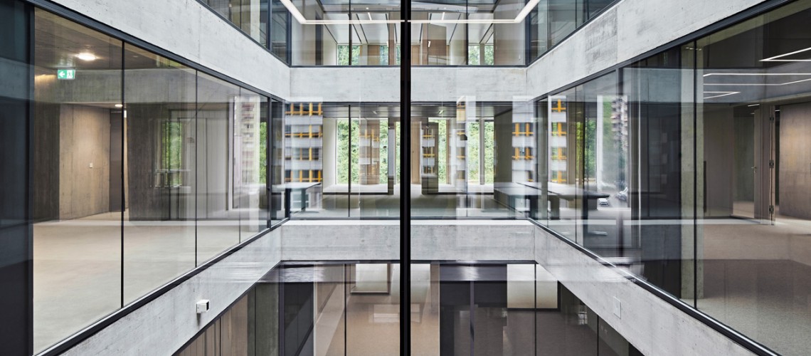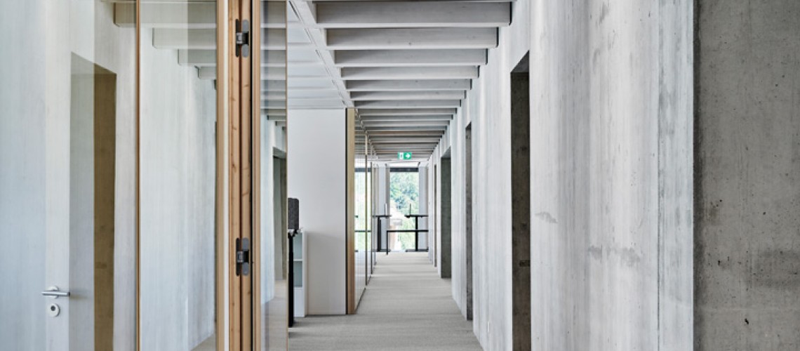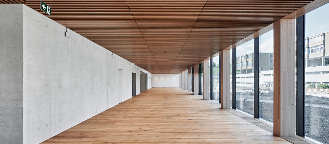 Das Gebäude besteht aus einem zentralen Betonkern und einem äusseren Teil, der in Holz-Beton-Hybridbauweise erstellt wurde. Das verwendete Holz – Fichte und Buche – stammt aus Schweizer Wäldern. Im Aussenteil befinden sich die Büros, die von viel Tageslicht und einer guten Belüftung profitieren. Sowohl bei den Sitzungszimmern als auch bei den Büros achteten die Planenden auf eine flexible Nutzbarkeit, sodass man die Raumgrösse und -ausrichtung bei einer Umnutzung ohne viel Aufwand anpassen kann.