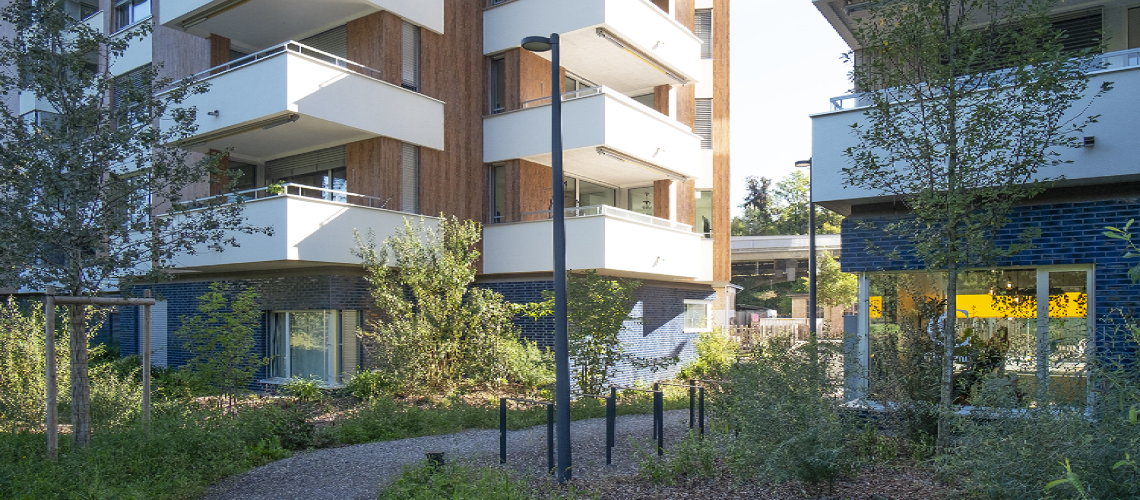 Vor dem Hintergrund der Vision «Naturnahes Wohnen im Süden von Zürich» entstand auf dem ehemaligen Gewerbeareal eine Wohnsiedlung, die im Erdgeschoss durch Dienstleistungs- und Gewerbenutzungen ergänzt wird. Das Projekt von hls Architekten und asp Landschaftsarchitekten ging aus einem Studienauftrag der Mobimo in kooperativer Zusammenarbeit mit der Logis Suisse AG als Sieger hervor.