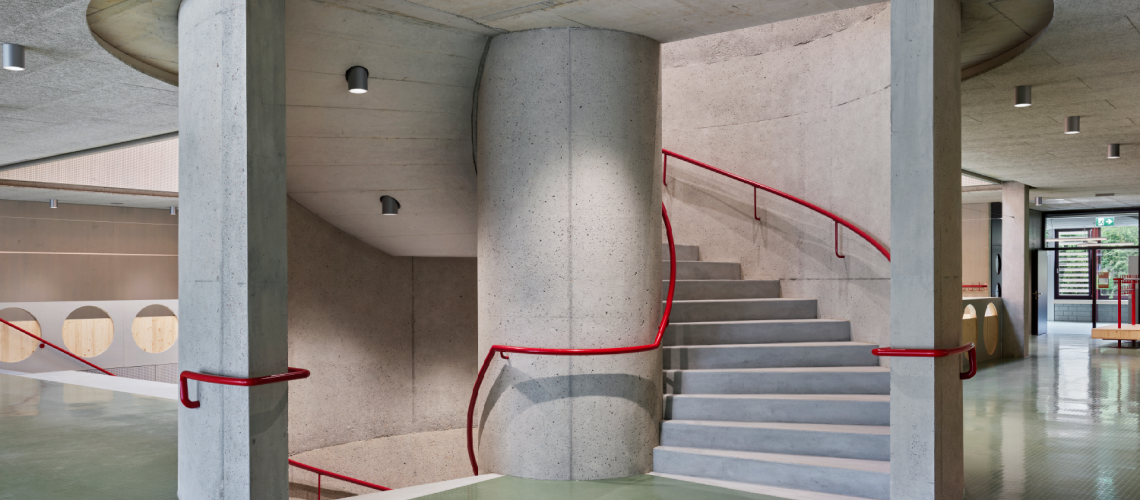 Die Schulanlage Kleinholz in Olten Süd schafft mit ihrer windmühlenartigen Typologie und den differenziert gestalteten Aussenräumen eine räumliche Mitte im Quartier. Sie vermittelt zwischen Stadthalle, Wohnbauten und Sportanlagen und bildet einen grosszügigen Grünraum. Das Gebäude bietet klare Zugänge, eine starke Innen-Aussen-Verbindung und flexible Lernlandschaften mit vielfältigen Raumkonstellationen. Im Inneren ermöglichen natürlich belichtete Korridore, Gruppenräume und offene Lernzonen ein zeitgemässes, individuelles und gemeinsames Lernen. Die Forumstreppe mit Foyer dient als Herzstück für Veranstaltungen und schafft Raum für Austausch und Gemeinschaft. So wird der Neubau zum lebendigen Zentrum eines multifunktionalen Quartierfreiraums mit hoher Aufenthaltsqualität für alle Nutzergruppen.