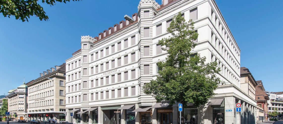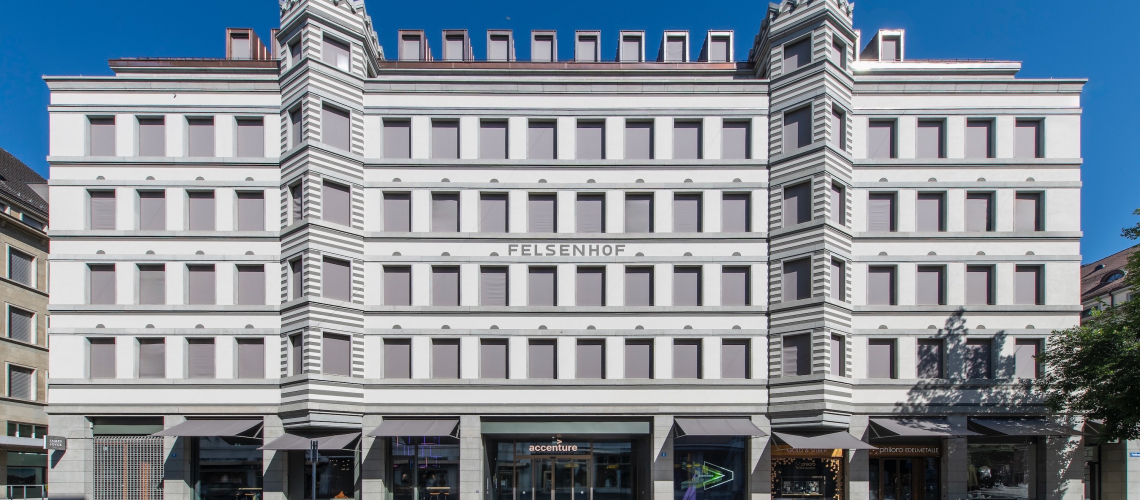 Das Felsenhof-Gebäude an der Pelikanstrasse wurde 1927 vom Architekten Hermann Weideli als Büro- und Geschäftshaus entworfen. Der Innenausbau und die Haustechnik hatten das Ende ihrer Lebensdauer erreicht, weshalb eine Gesamtsanierung angestrebt wurde. Das Gebäude, das sich heute im Besitz der Swiss Life befindet, wurde in einen zeitgemässen Grundausbau überführt. Dieser bietet Platz für attraktive und flexible Büronutzungen. Die markanten, klaren Linien des Gebäudes, die rhythmische Fensteranordnung und die dezente Fassade verleihen dem Felsenhof eine strukturierte, beinahe introvertierte Präsenz. Der sanierte Felsenhof verfügt nun über ein innovatives Nutzungsangebot: Neben Kollaborationsflächen, Einzelbüros, Meetingräumen, mobilen Telefonzellen, einer Werkstatt für Prototypenentwicklung, einem Sportraum, Ruheräumen und einem Video-Studio, gibt es auch voll ausgestattete Küchen. Die Wärmeversorgung erfolgt weiterhin über den Nahwärmeverbund der Nachbarliegenschaft. Da der Energieträger (Gas) nicht gewechselt werden konnte, wurde auf Biogas umgestellt. Sobald das Seewasserverbundnetz ‹CoolCity› ausgebaut ist, wird die Liegenschaft dort angeschlossen. Zur Parzelle des Felsenhofs gehört praktisch kein Aussenraum. In unmittelbarer Nähe befinden sich jedoch zahlreiche Abstellmöglichkeiten für den Langsamverkehr.