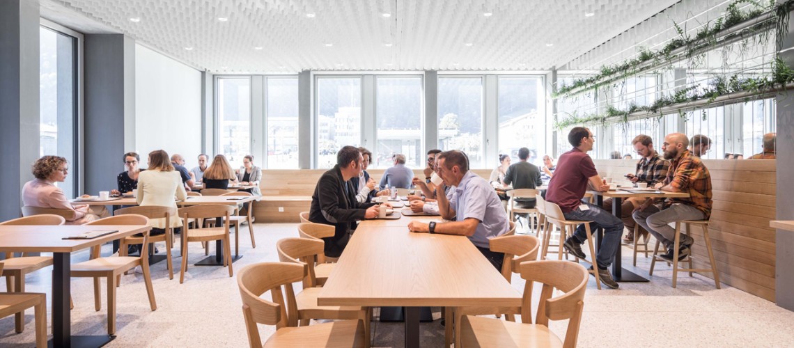 Das neue Verwaltungsgebäude «sinergia» im Westen des Bündner Hauptorts Chur bietet seit Sommer 2020 rund 440 Arbeitsplätze für Mitarbeitende des Kantons. Dieser spart durch die örtliche Konzentration verschiedener Verwaltungsbereiche Kosten, nutzt Synergien und Abläufe werden optimiert. Auch für die Mitarbeitenden sind die neuen Arbeitsplätze attraktiv: Statt in Einer- oder Zweierbüros arbeiten sie nun in einem Open-Space-Büro, dem sogenannten «Arbeitsplatz 4.0». Die Nutzenden können ihren Arbeitsplatz je nach aktuellem Bedarf flexibel wählen. Damit will der Kanton eine Enthierarchisierung und ein innovatives Klima erreichen.