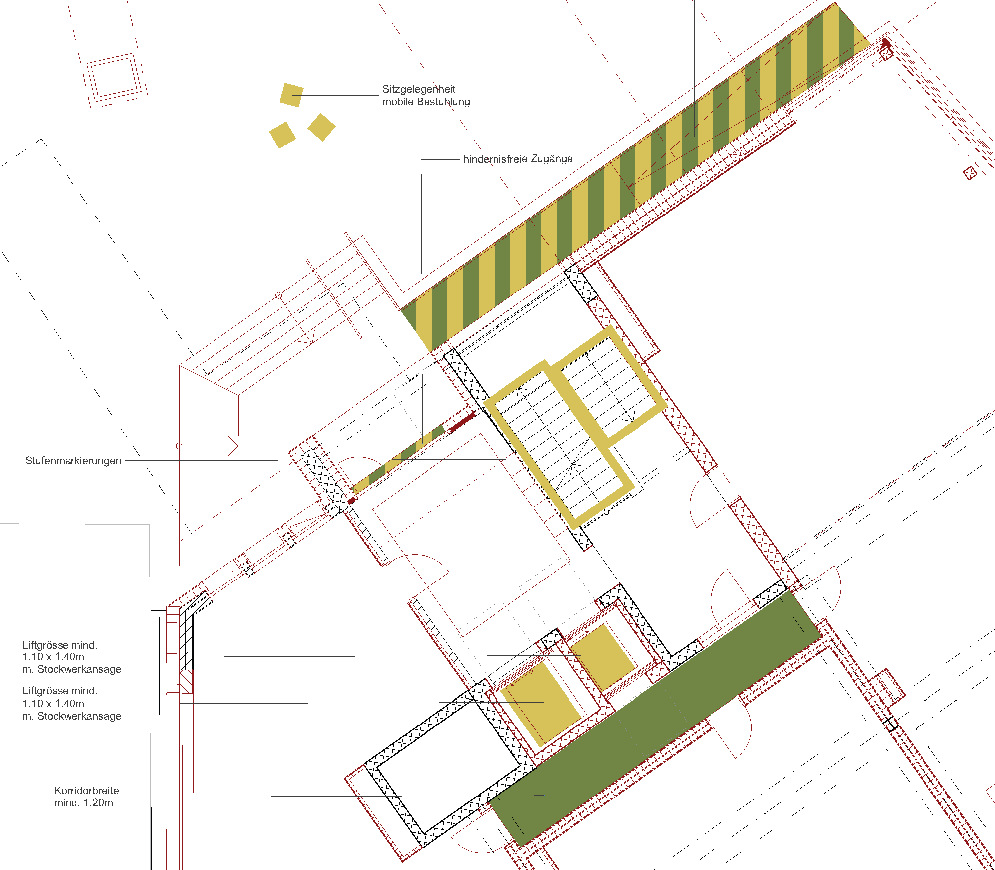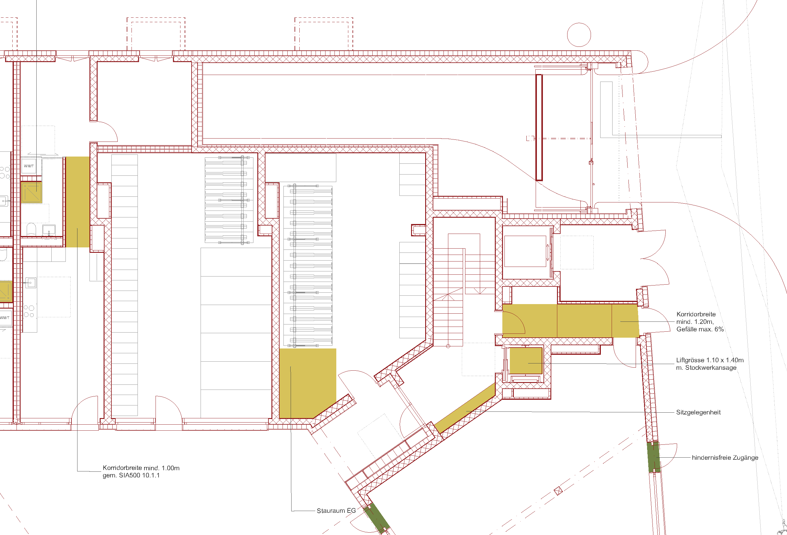 Abbildung 1: Nachweis der erhöhten Anforderungen an die Hindernisfreiheit im Plan - Erdgeschoss (Verfasser: jessenvollenweider architektur, Projekt: Wohn- und Geschäftshaus Hauptstrasse 2 in Brugg, 21.05.2024)