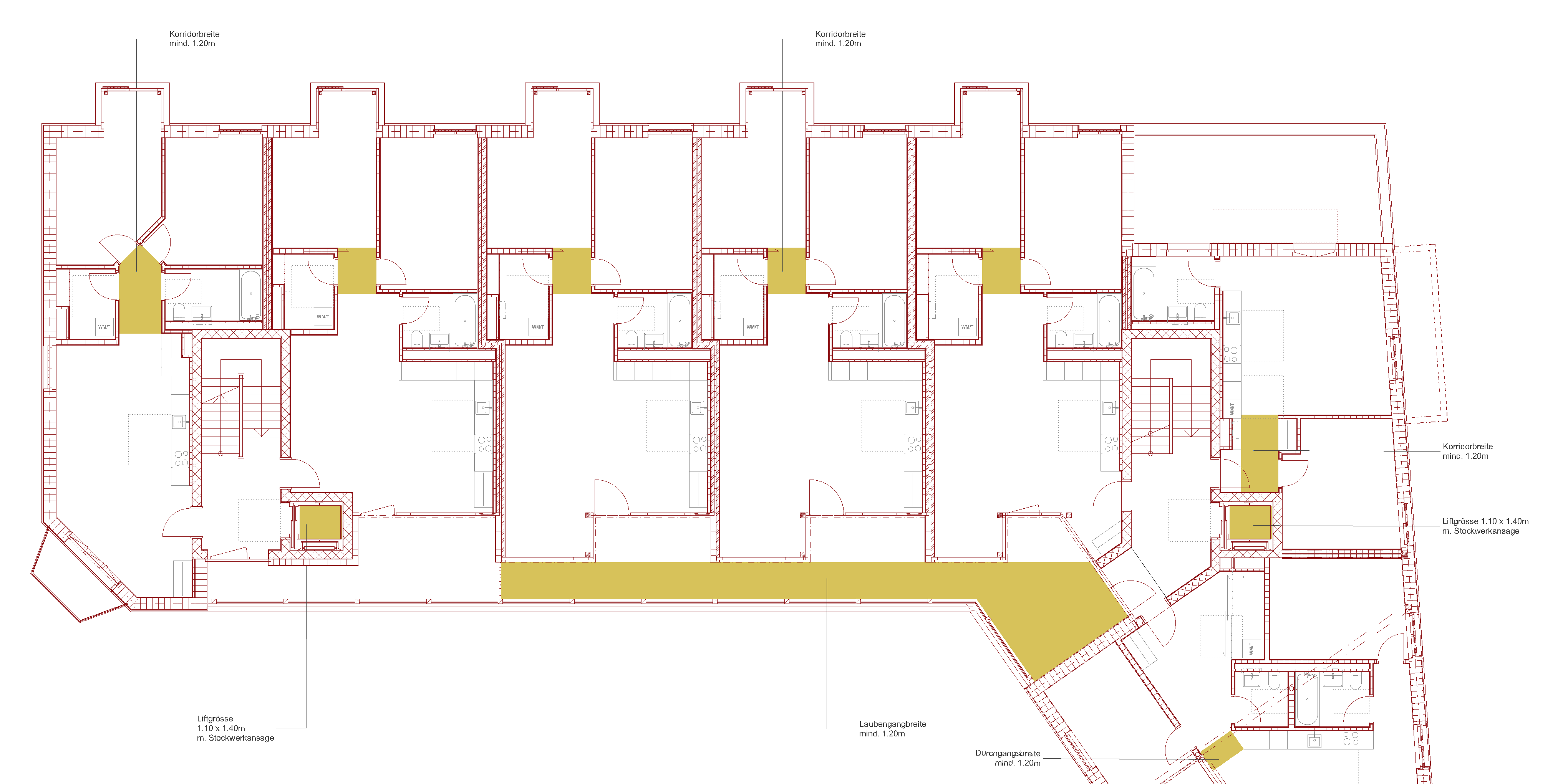 Abbildung 3: Nachweis der erhöhten Anforderungen an die Hindernisfreiheit im Plan - Regelgeschoss (Verfasser: jessenvollenweider architektur, Projekt: Wohn- und Geschäftshaus Hauptstrasse 2 in Brugg, 21.05.2024)