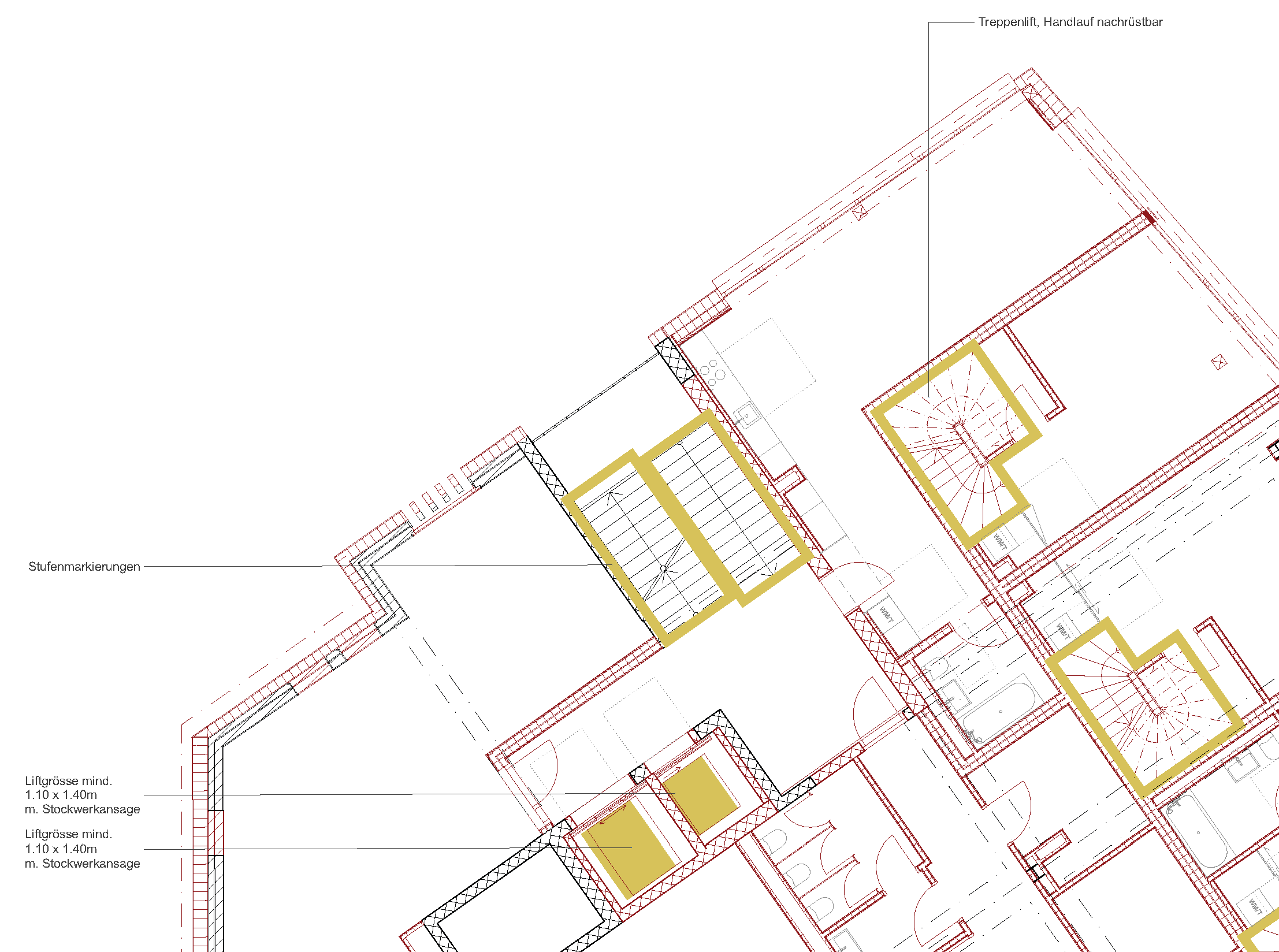 Abbildung 4: Nachweis der erhöhten Anforderungen an die Hindernisfreiheit im Plan - Regelgeschoss (Verfasser: jessenvollenweider architektur, Projekt: Wohn- und Geschäftshaus Hauptstrasse 2 in Brugg, 21.05.2024)